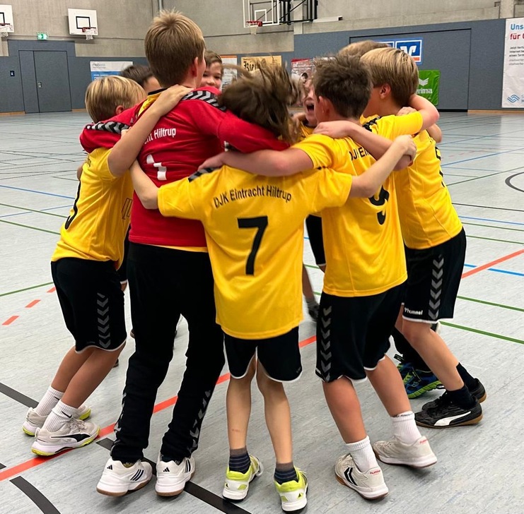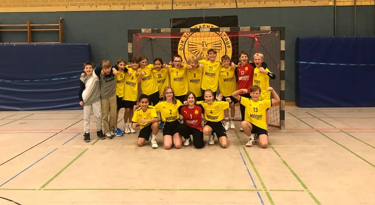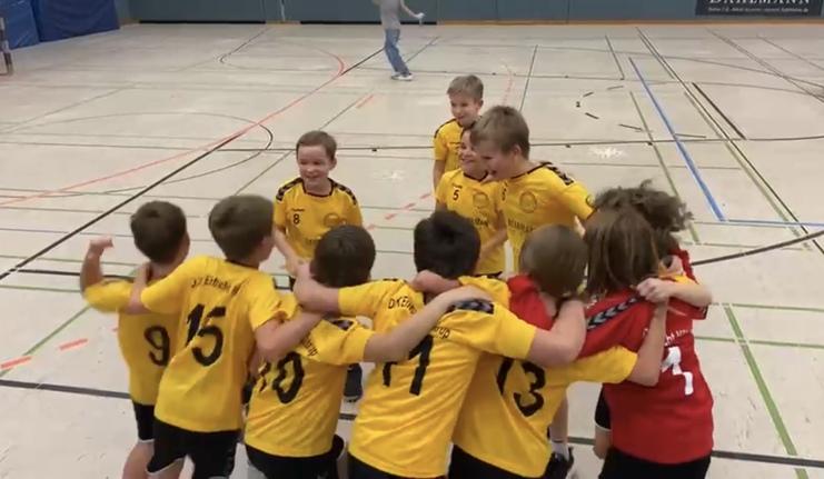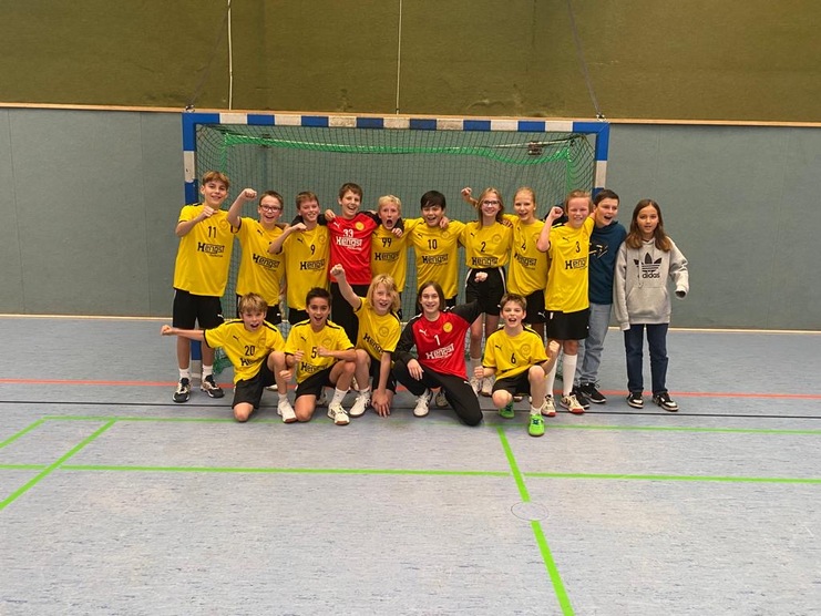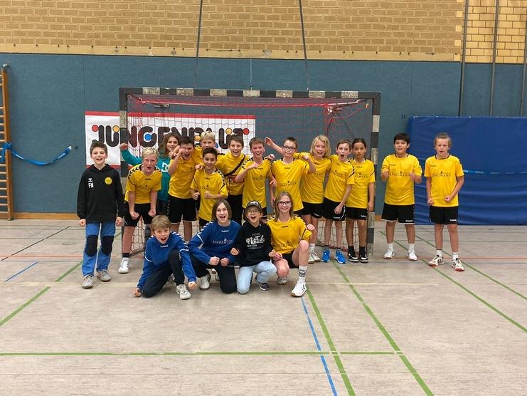 Die siegreiche Mannschaft inklusive Support: Fiene, Till, Joos, (9 Tore), Tristan (2), Mats (6), Ida (2), Bence, Lukka, Enno (3), Luca (1), Paul, Ferdi (2), Silas (2), Can (4), Fabi, Henri, Jonte und Marie