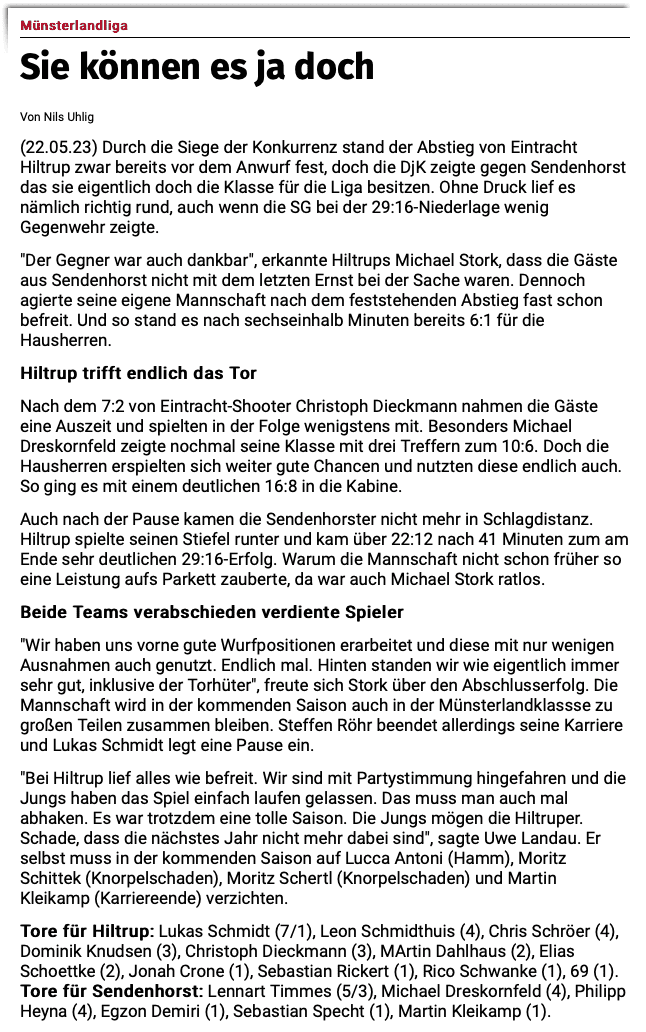 Durch die Siege der Konkurrenz stand der Abstieg von Eintracht Hiltrup zwar bereits vor dem Anwurf fest, doch die DjK zeigte gegen Sendenhorst das sie eigentlich doch die Klasse für die Liga besitzen.