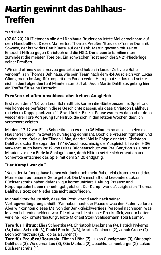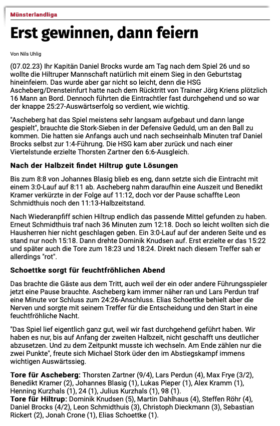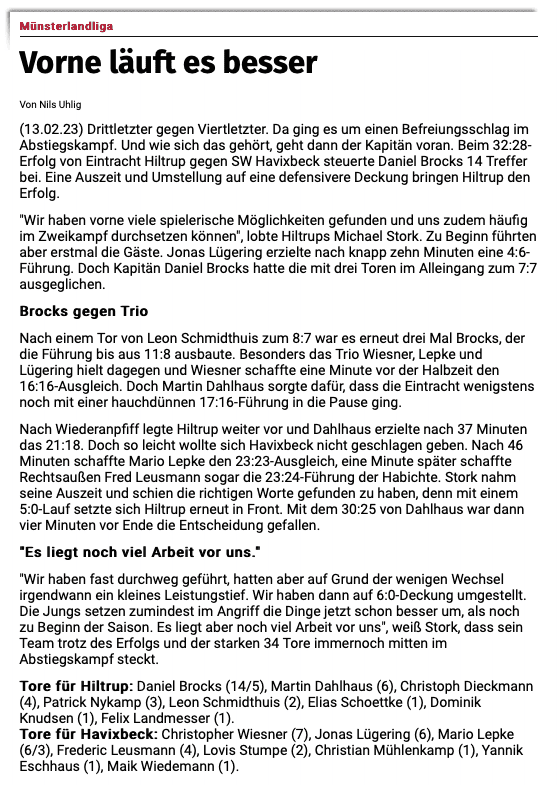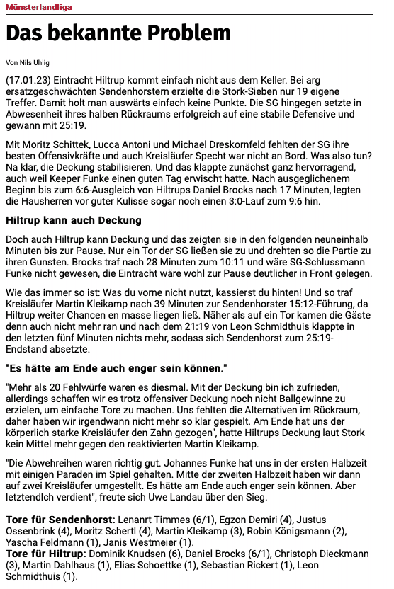 Die DJK Eintracht Hiltrup gewinnt auswärts gegen den SC Westfalia Kinderhaus mit 12:17 und feiert am Ende mit einem kleinen Freudentänzchen. Besonders herausragend war die Leistung von Ida Filusch, die neun Tore erzielte, darunter zwei verwandelte 7-Meter. Trotz zahlreicher gut herausgespielter Tormöglichkeiten konnte die Kinderhauser Torhüterin nicht alle Chancen der Hiltruperinnen vereiteln.