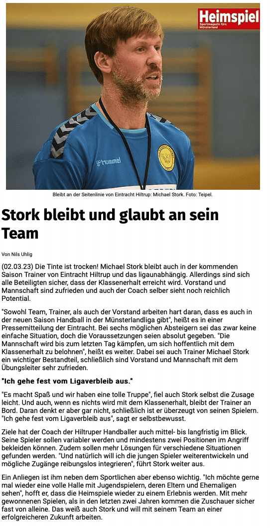 Die Tinte ist trocken! Michael Stork bleibt auch in der kommenden Saison Trainer von Eintracht Hiltrup und das ligaunabhängig.