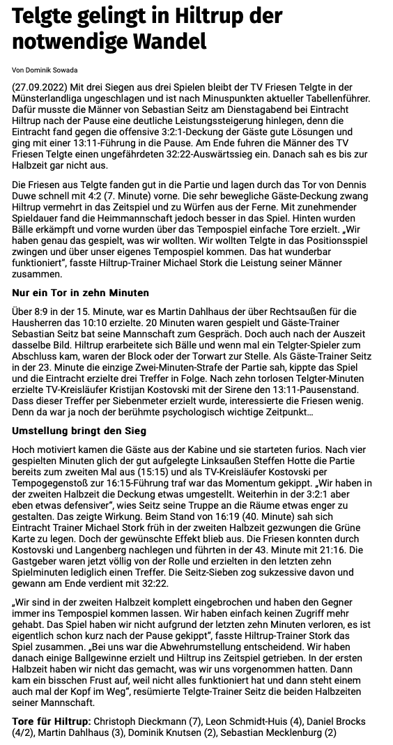 Mit drei Siegen aus drei Spielen bleibt der TV Friesen Telgte in der Münsterlandliga ungeschlagen und ist nach Minuspunkten aktueller Tabellenführer.