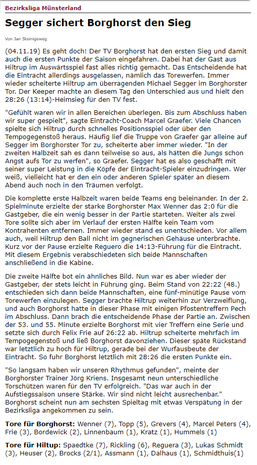 Es geht doch! Der TV Borghorst hat den ersten Sieg und damit auch die ersten Punkte der Saison eingefahren. Dabei hat der Gast aus Hiltrup im Auswärtsspiel fast alles richtig gemacht.