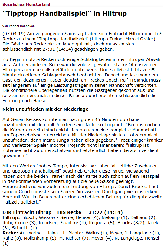 Am vergangenen Samstag trafen sich Eintracht Hiltrup und TuS Recke zu einem "Tipptopp Handballspiel" (Hiltrups Trainer Marcel Gräfer).