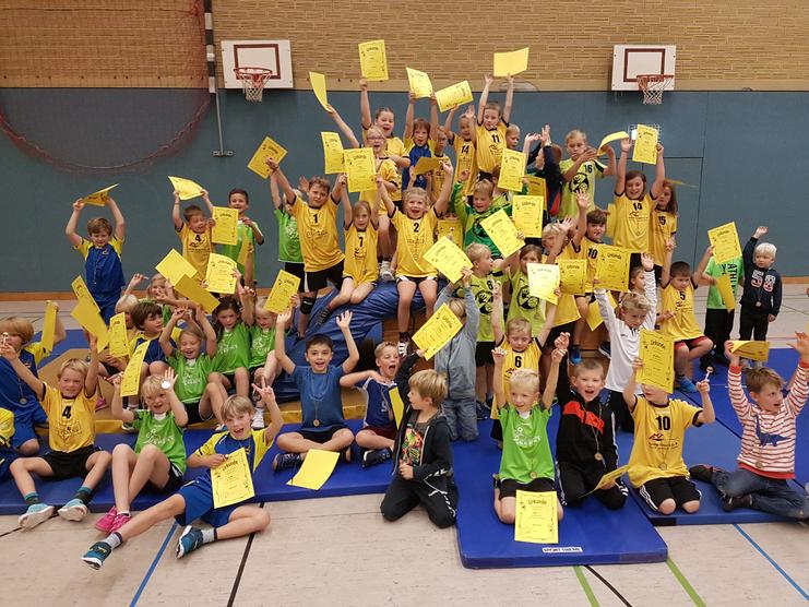 Ein Meer aus gelben Urkunden und die Medaille um den Hals: Hier sind alle Sieger. Auch in diesem Jahr hatte die DJK Eintracht Hiltrup zum Handball-Minispielfest geladen. Mehr als 50 Kinder aus Senden, Havixbeck, Gievenbeck, Neuenkirchen und Hiltrup folgten der Einladung und gaben alles. Nicht nur auf dem Spielfeld wurde um jeden Ball hart gekämpft. In den Spielpausen wuselten die 5- bis 8-Jährigen durch die Sporthalle am Schwimmbad und nutzten eifrig auch die vorbereiteten Bewegungsstationen. Nicht der Erfolg, sondern der Spaß am Spiel steht bei den Minispielfesten im Vordergrund. Da ist es auch egal, wenn die Regeln noch nicht sitzen oder ein Kind versehentlich auf den eigenen Torwart zustürmt, fest entschlossen jetzt endlich ein Tor zu werfen. Am Ende nahmen alle erschöpft und glücklich den verdienten Lohn im Empfang.
