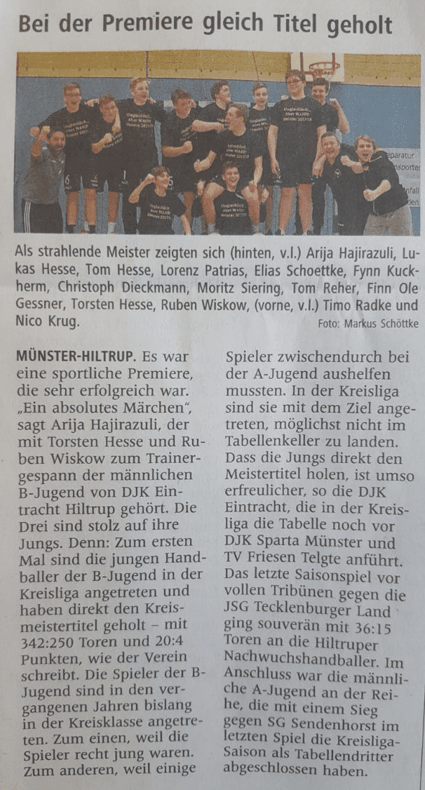 Der Saisonabschluss in unserer Dreifachhalle am Schwimmbad war Samstag sehr erfolgreich. Mit zwei wunderbaren Spielen unserer B-Jugend und unserer A-Jugend wurde die Saison mit einer tollen Stimmung beendet. Die B-Jugend konnte das letzte Spiel gegen die JSG Tecklenburger Land deutlich mit 36:15 gewinnen und ist damit mit 20:4 Punkten Meister in der Kreisliga geworden. Die A-Jugend ist durch den Sieg gegen die SG Sendenhorst im letzten Saisonspiel der Kreisliga-Saison mit 14:16 Punkten Tabellendritter geworden. Mit 37:31 konnten sie sich erfolgreich durchsetzen.