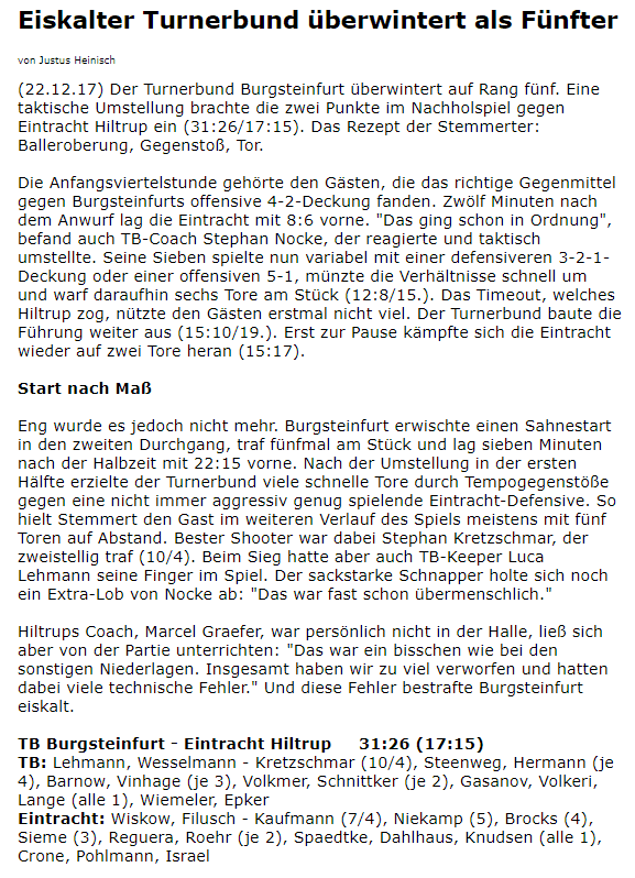 Der Turnerbund Burgsteinfurt überwintert auf Rang fünf. Eine taktische Umstellung brachte die zwei Punkte im Nachholspiel gegen Eintracht Hiltrup ein (31:26/17:15).
