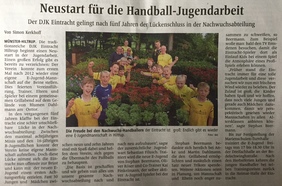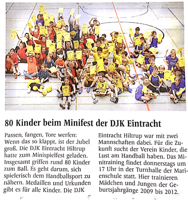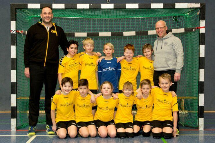 Die neu formierte E-Jugend der DJK Eintracht Hiltrup ist erfolgreich in die Saison gestartet. An jedem Spieltag treten drei Mannschaften im Tuniermodus gegeneinander an. Am ersten Spieltag konnten die Nachwuchshandballer mit 11:1 einen deutlichen Sieg gegen den ASV Senden feiern, mussten bei der 3:9 Niederlage gegen den BSV Roxel aber die körperliche Überlegenheit der Gäste anerkennen. Noch besser lief es am vergangenen Wochenende. Auch hier gab es mit 16:6 einen klaren Erfolg gegen Bever-Ems. Im zweiten und äußerst spannenden Spiel konnten die DJK-ler einen 2:4 Rückstand gegen Ascheberg-Drensteinfurt bis zur Halbzeitpause (4:4) ausgleichen, um dann am Ende mit 8:7 das Feld als Sieger zu verlassen. Das Trainergespann Stephan Beermann und Oliver Röser zeigte sich hocherfreut über die tolle spielerische und kämpferische Mannschaftsleistung, so konnten sich auch mehrere Spieler sich in die Torschützenliste eintragen.