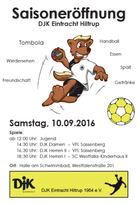Am 10.09. (Sa.) findet unsere Saisoneröffnung ab 12:00 Uhr an und in der Dreifachhalle statt und dient dabei als Ersatz für unser ausgefallenes Sommerfest im Juni, das aufgrund des schlechten Wetters abgesagt werden musste. Wir laden alle Handballinteressierten ein diesen Hallentag mit uns zu verbringen und hoffen zum Saisonstart darauf viele Siege einfahren zu können und bei Speis und Trank sowie einer Tombola einen gemütlichen Tag zu verbringen.