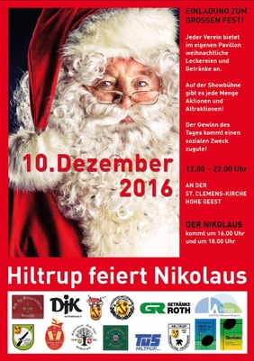 Am 10. Dezember (Samstag, von 12:00 - 22:00 Uhr) feiert Hiltrup an der St. Clemens-Kirche Nikolaus. Verschiedene Vereine, unter anderem auch wir, bieten weihnachtliche Leckereien und Getränke an. Der Nikolaus wird um 16:00 und 18:00 Uhr vorbeikommen, außerdem wird es eine Showbühne mit unterschiedlichen Aufführungen geben. Ein Besuch lohnt sich also, kommt vorbei...!!!