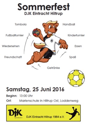 Am 25.06. (Sa.) ab 13:00 Uhr ist es soweit, dann trifft sich die Eintracht aus Hiltrup zum Sommerfest an der Marienschule. Neben den sportlichen Aktivitäten wie beim Handball- und Fußball-Turnier steht der Spaß im Vordergrund. Neben leckerem Essen (Kuchen, Reibeplätzen, Grillstand) und Getränken gibt es für Groß und Klein auch eine Tombola und man kann sich z. B. am Nagelbalken oder der Torwand beweisen. Zudem können sich die Kinder auf der Hüpfburg oder beim Kinderschminken amüsieren. Vereinsmitglieder und Gäste sind herzlich eingeladen den Tag mit uns zu verbringen.