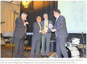 Als Geschenk des DJK-Verbandes übergab Remi Mensing dem Vorsitzenden Manfred Bahr einen Fuß- und Handball sowie eine Fahne, die das Motto des DJK „Sport um der Menschen Willen“ präsentierte. Dieser zeigte sich ebenfalls sichtlich gerührt, als ihm der DJK-Verband das DJK-Ehrenzeichen und einen Ehrenpokal für seine langjährige Tätigkeit als Vereinsvorsitzender verlieh.