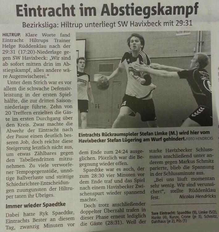 Bezirksliga: Hiltrup unterliegt SW Havixbeck mit 29:31