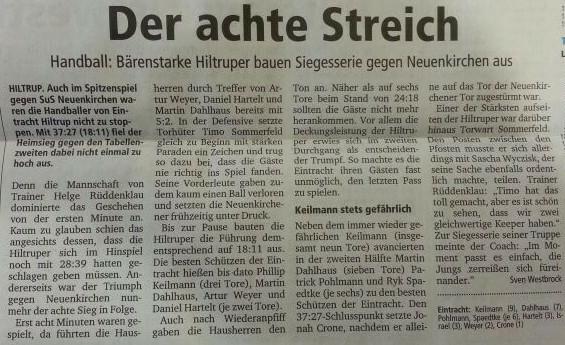 Tore für Hiltrup: Keilmann, Spaedtke (je 6), Rickling (4), Israel (3), Hartelt (3/3), Pohlmann, Weyer (je 2), Dahlhaus, Crone (je 1), Piltz, Thür - Sommerfeld, Wyczisk
