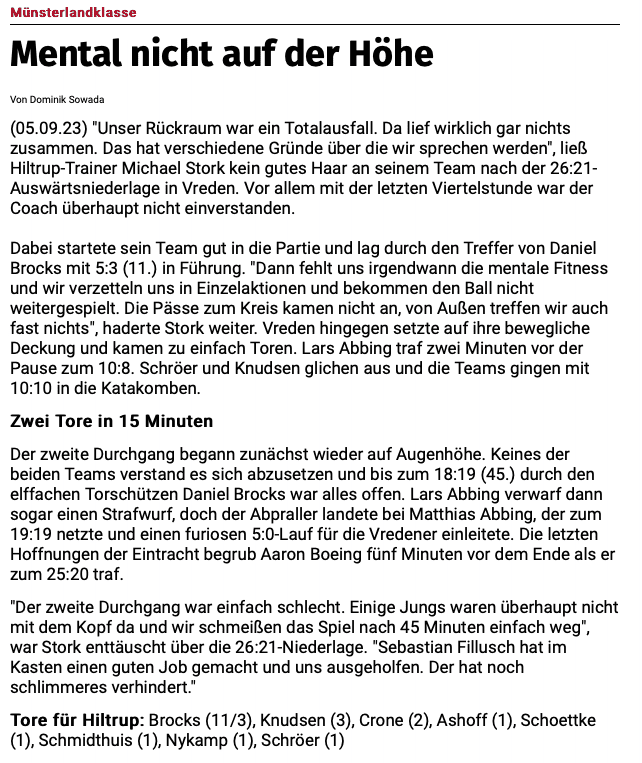 "Unser Rückraum war ein Totalausfall. Da lief wirklich gar nichts zusammen. Das hat verschiedene Gründe über die wir sprechen werden", ließ Hiltrup-Trainer Michael Stork kein gutes Haar an seinem Team nach der 26:21-Auswärtsniederlage in Vreden.